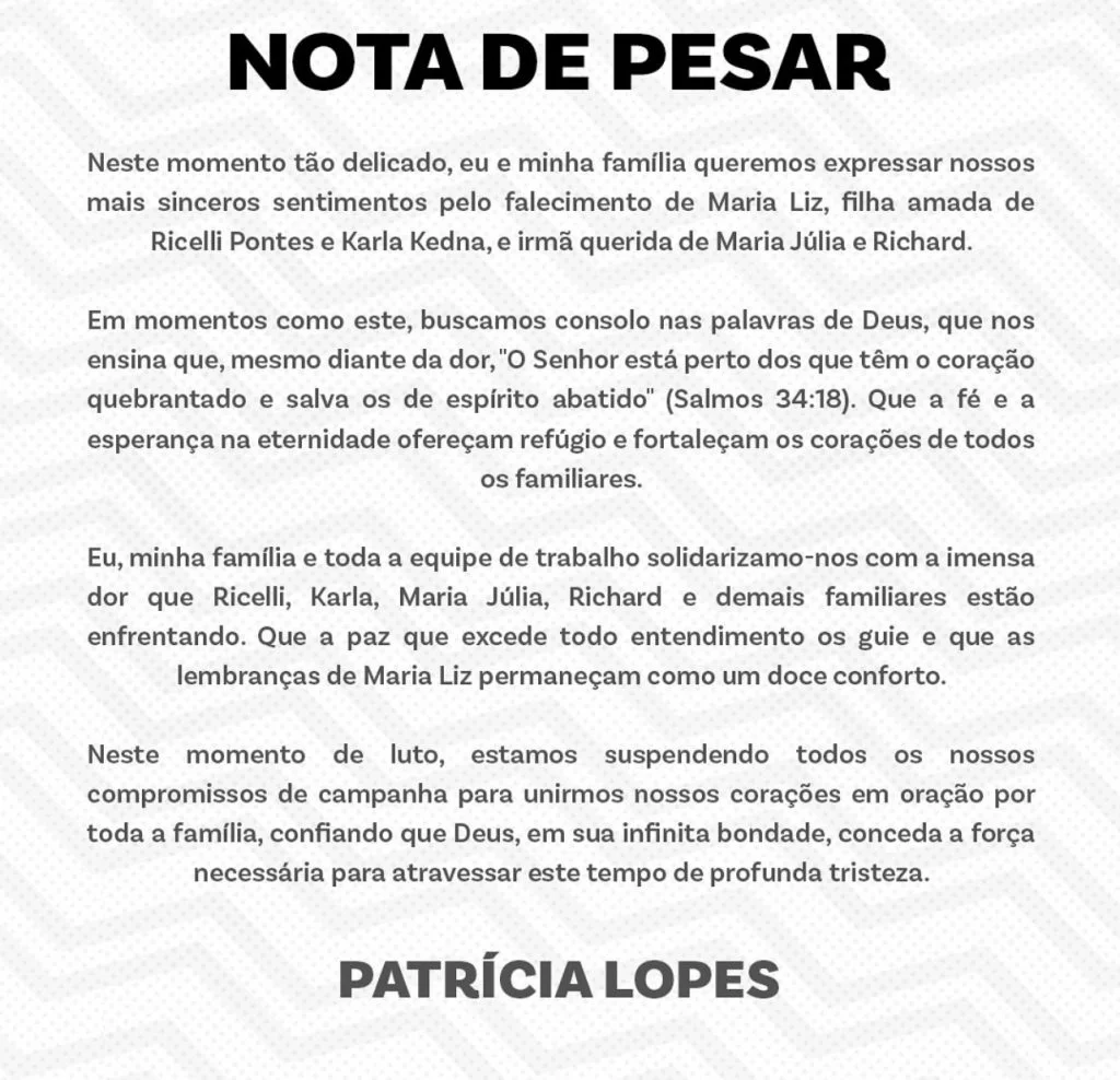 Em uma demonstração de respeito e empatia, a prefeita de Presidente Figueiredo, Patrícia Lopes, anunciou a suspensão dos compromissos de campanha, permitindo que a população e os membros da administração municipal expressem seu apoio à família do vice-prefeito. “Neste momento tão delicado, eu e minha família queremos expressar nossos mais sinceros sentimentos pelo falecimento de Maria Liz, filha amada de Ricelli Pontes e Karla Kedna, e irmã querida de Maria Júlia e Richard”, declarou Patrícia Lopes em uma nota oficial. A prefeita ressaltou a solidariedade da comunidade e o impacto profundo da perda para todos os envolvidos.