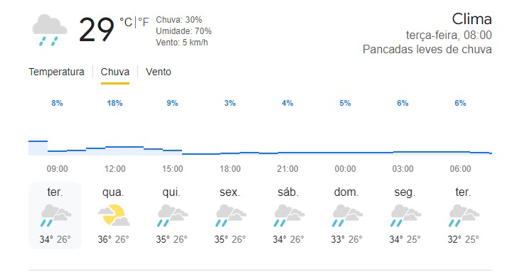 Segundo o Clima Tempo, a temperatura mínima para o dia é de 28°C, enquanto a máxima pode chegar a 37°C, com umidade relativa do ar em torno de 42%. A previsão ainda aponta 30% de chance de novas chuvas, umidade de 70% e ventos de apenas 5 km/h, indicando que o calor deve persistir ao longo do dia, mas com a esperança de mais alívio.