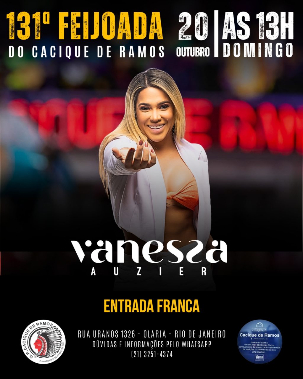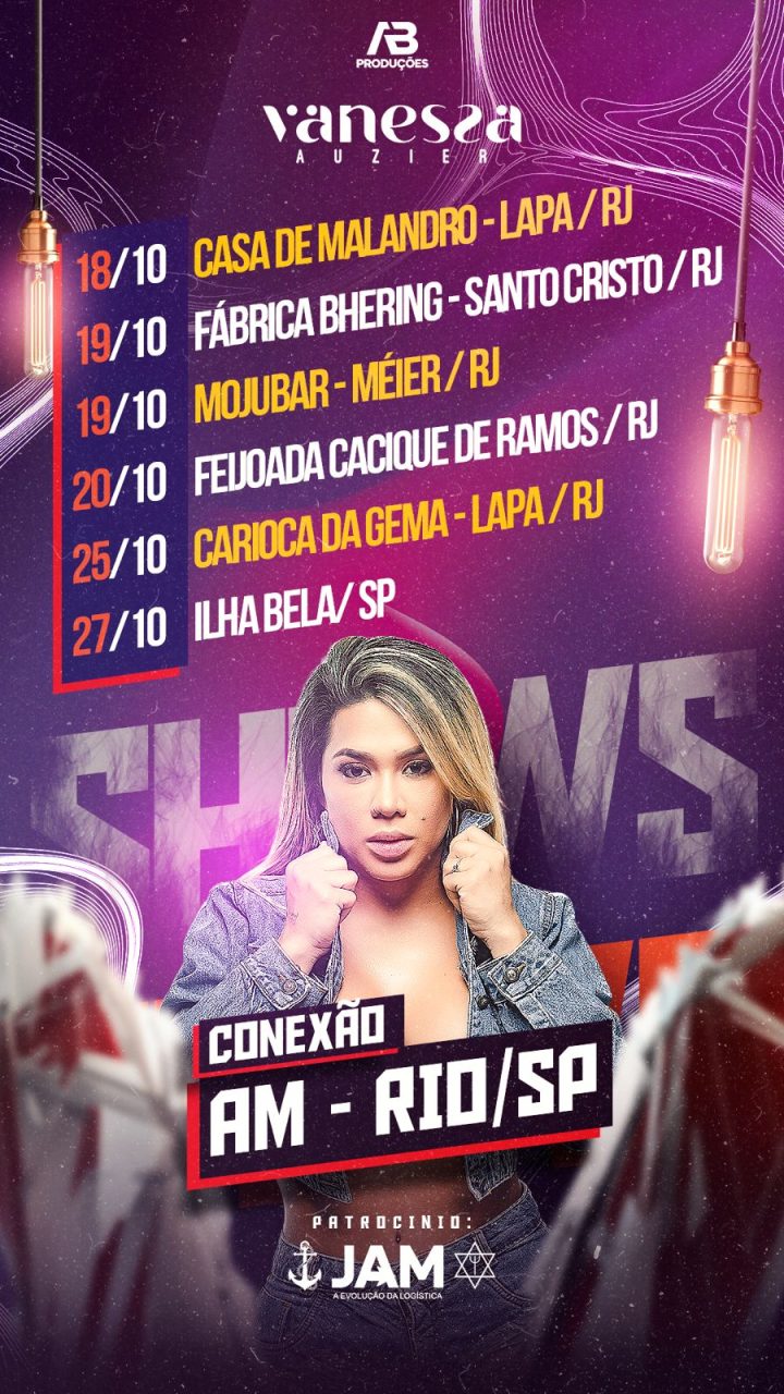 Na capital carioca, com patrocínio da Jam Logística, Vanessa Auzier vai dividir o palco com o cantor Enzo Belmont em mais de 6 casas de shows, inclusive, no Cacique de Ramos, no dia 20 de outubro. No total, são 14 dias de intercâmbio cultural.