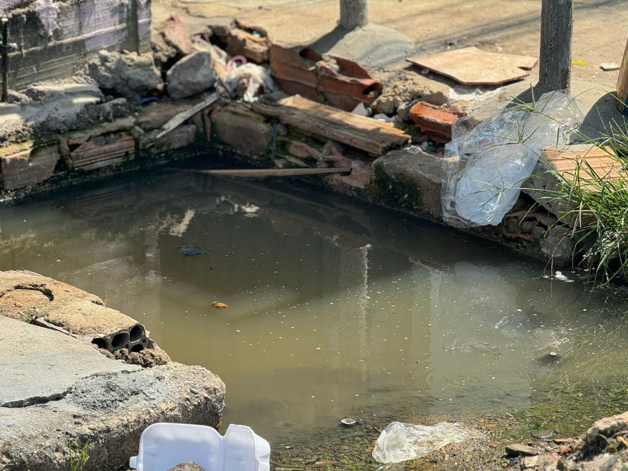 O bueiro está localizado em uma área movimentada, próxima a barracas de lanche e com grande circulação de pedestres. Além dos riscos estruturais, o odor do esgoto aberto e o acúmulo de sujeira impactam diretamente a qualidade de vida dos moradores, que temem enfrentar mais um fim de ano nessa situação.
