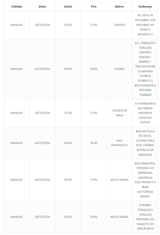 Moradores seis bairros de Manaus ficarão sem o fornecimento de energia elétrica neste domingo (24), por causa de uma manutenção programada da concessionária Amazonas Energia. O serviço deve ser executado entre 7h e 17h.