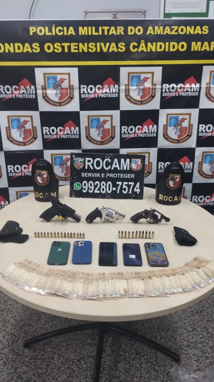 MANAUS-AM | Na noite desta quarta-feira (28), a Polícia Militar de Manaus, através da equipe da ROCAM (Rondas Ostensivas Cândido Mariano), apreendeu quatro armas de fogo durante uma operação no bairro Alvorada. A ação teve início a partir de uma denúncia anônima que informava sobre a venda de armas ilegais na região.