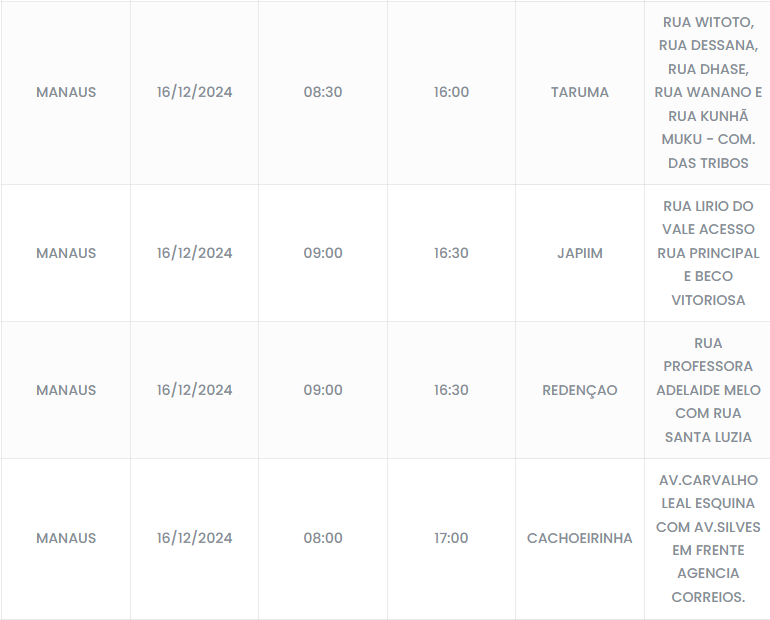 Nesta segunda-feira (16), diversos bairros de Manaus passarão por interrupções programadas no fornecimento de energia elétrica. As suspensões são parte das ações da Amazonas Energia para realizar manutenções e melhorias na rede elétrica, com o objetivo de garantir a confiabilidade do serviço para a população.