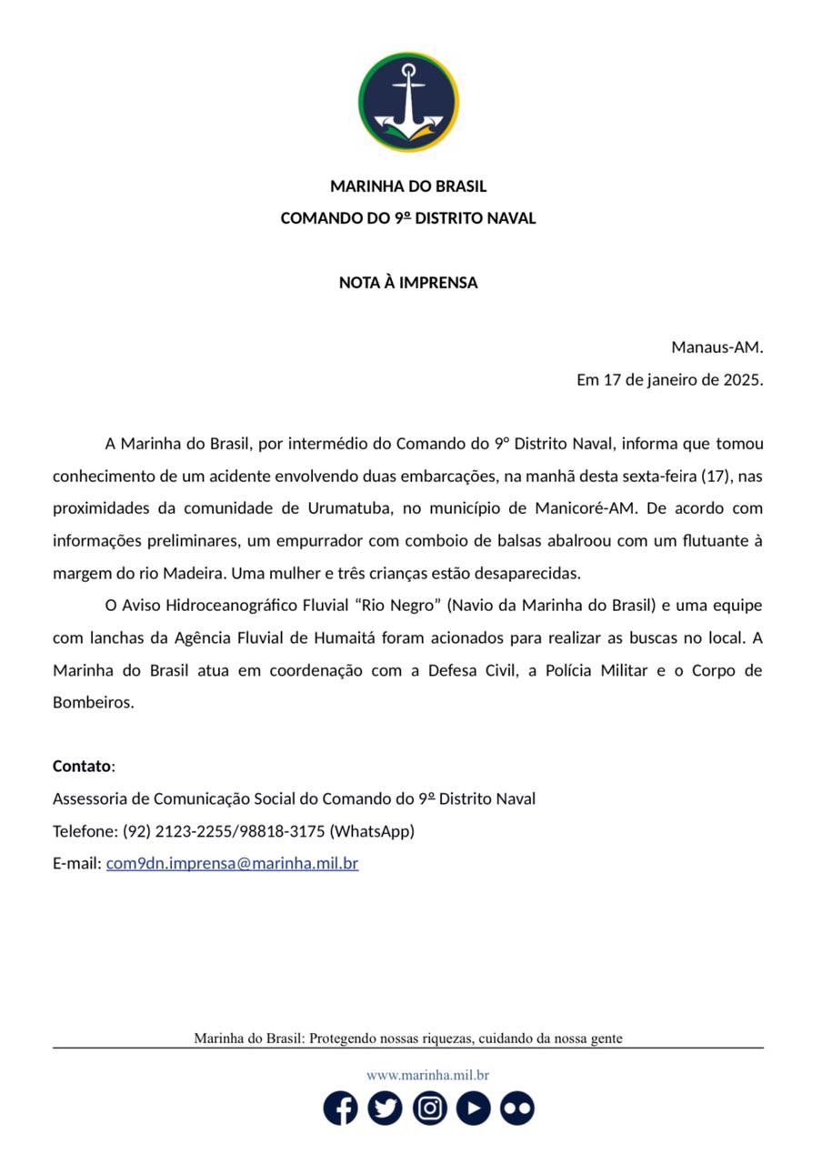 A Assessoria de Comunicação Social do Comando Naval disponibilizou os contatos (92) 2123-2255/98818-3175 (WhatsApp) e o e-mail com9dn.imprensa@marinha.mil.br para mais informações.