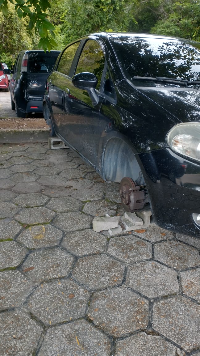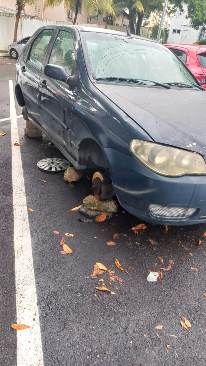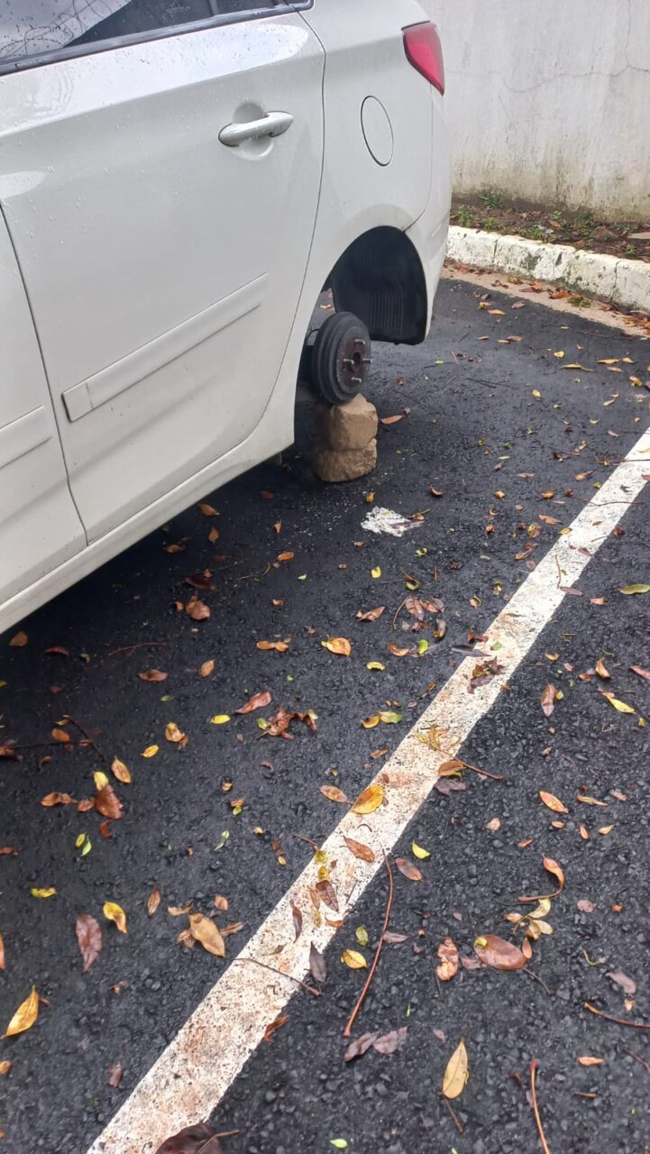 Além do carro da mulher, outro veículo estacionado no mesmo pátio teve uma roda levada pelos criminosos. Os autores do furto agiram de forma rápida, removendo os itens sem chamar atenção, segundo relatos.