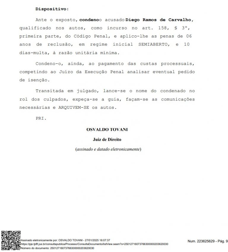 O acompanhante de luxo Diego Ramos de Carvalho foi condenado a 6 anos e 11 meses de prisão em regime semiaberto por extorsão, sequestro e lesão corporal grave contra o jornalista manauara Izaías Godinho, de 28 anos. A sentença foi proferida pela 8ª Vara Criminal do Tribunal de Justiça do Distrito Federal (TJ-DF), em um caso que chocou a capital federal em maio de 2024.