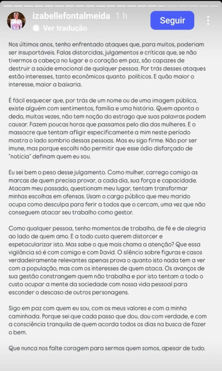 Em meio a críticas crescentes, a primeira-dama de Manaus, Izabelle Fontenelle, publicou uma nota controversa nas redes sociais que está gerando forte reação negativa. No texto, ela se coloca ostensivamente na posição de vítima, alegando sofrer ataques “insuportáveis” enquanto evita abordar as críticas substantivas à gestão de seu marido, o prefeito David Almeida (Avante).