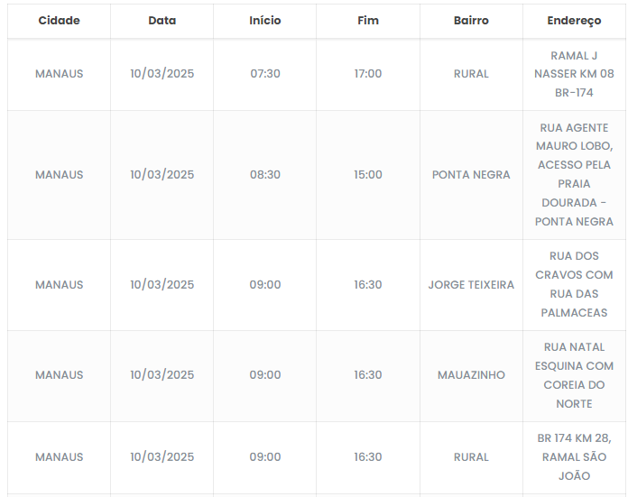 A concessionária Amazonas Energia realizará manutenções na rede elétrica neste segunda-feira (10), resultando na interrupção temporária do fornecimento de energia em alguns bairros de Manaus. A empresa informou que os desligamentos são necessários para garantir melhorias na infraestrutura elétrica e evitar futuros problemas no sistema.