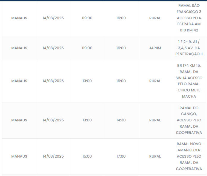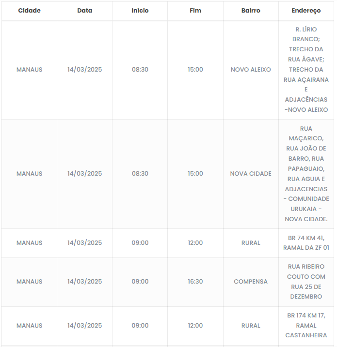 A concessionária Amazonas Energia realizará manutenções na rede elétrica neste sexta-feira (14), resultando na interrupção temporária do fornecimento de energia em alguns bairros de Manaus. A empresa informou que os desligamentos são necessários para garantir melhorias na infraestrutura elétrica e evitar futuros problemas no sistema.
