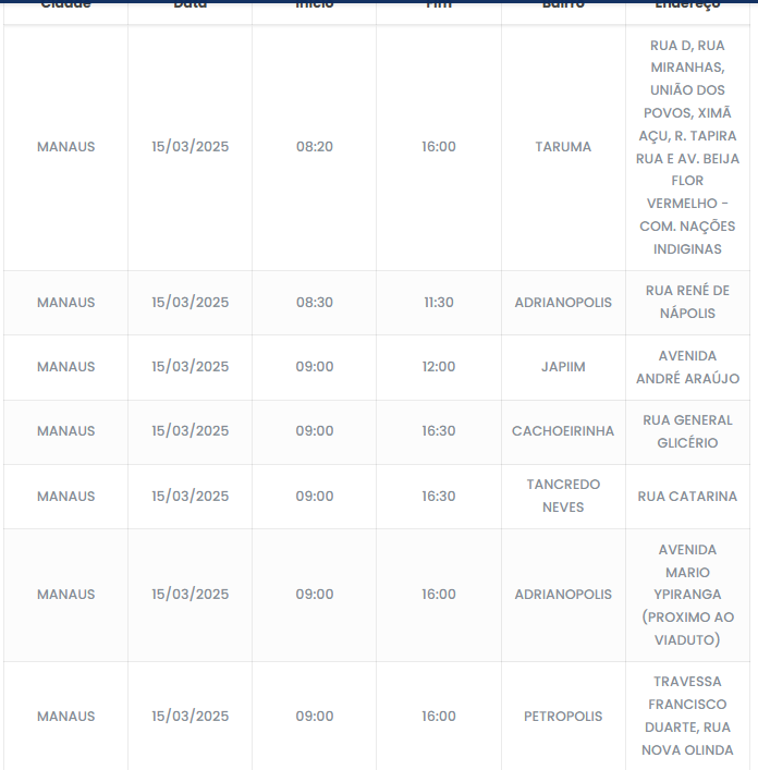 A concessionária Amazonas Energia realizará manutenções na rede elétrica neste sábado (15), resultando na interrupção temporária do fornecimento de energia em alguns bairros de Manaus. A empresa informou que os desligamentos são necessários para garantir melhorias na infraestrutura elétrica e evitar futuros problemas no sistema.