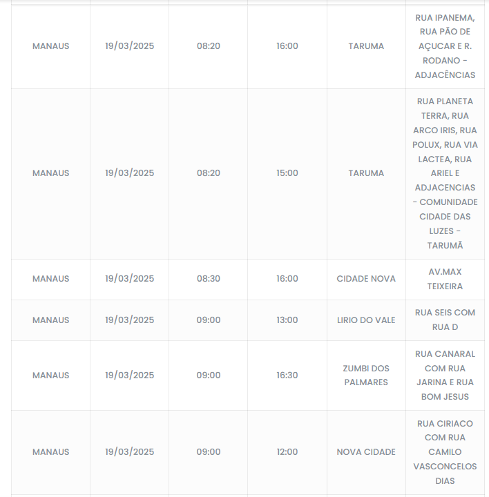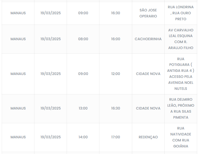 A concessionária Amazonas Energia realizará manutenções na rede elétrica neste quarta-feira (19), resultando na interrupção temporária do fornecimento de energia em alguns bairros de Manaus. A empresa informou que os desligamentos são necessários para garantir melhorias na infraestrutura elétrica e evitar futuros problemas no sistema.