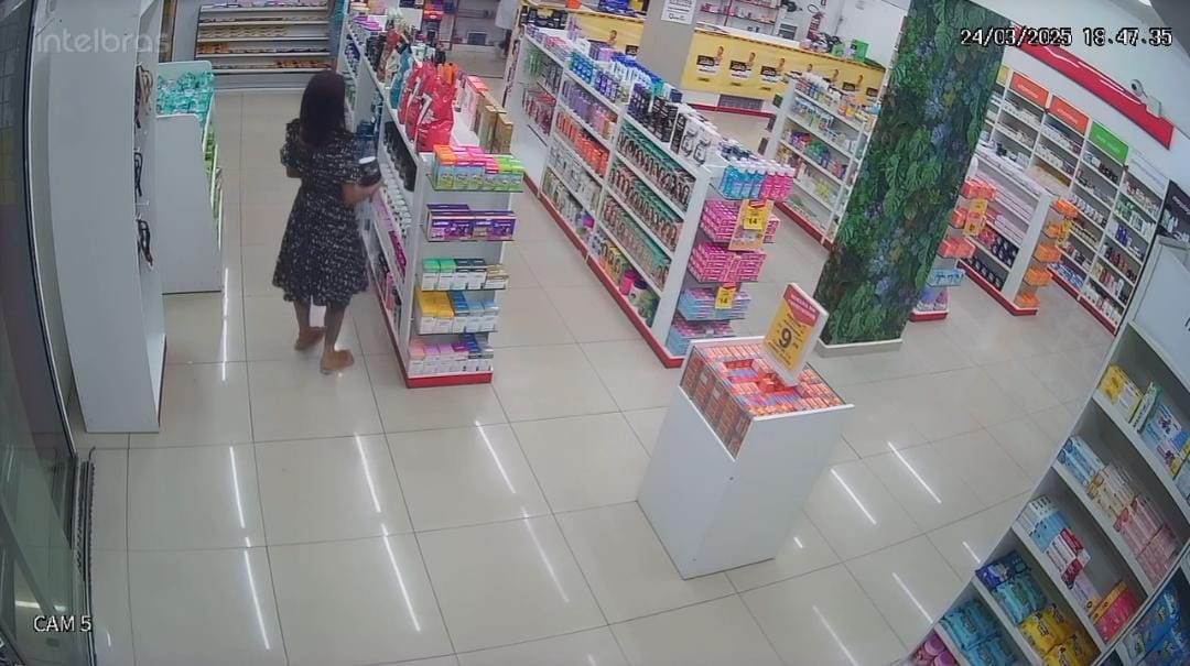 Mulher é flagrada furtando suplementos de creatina em farmácia de Manaus em duas ocasiões distintas.