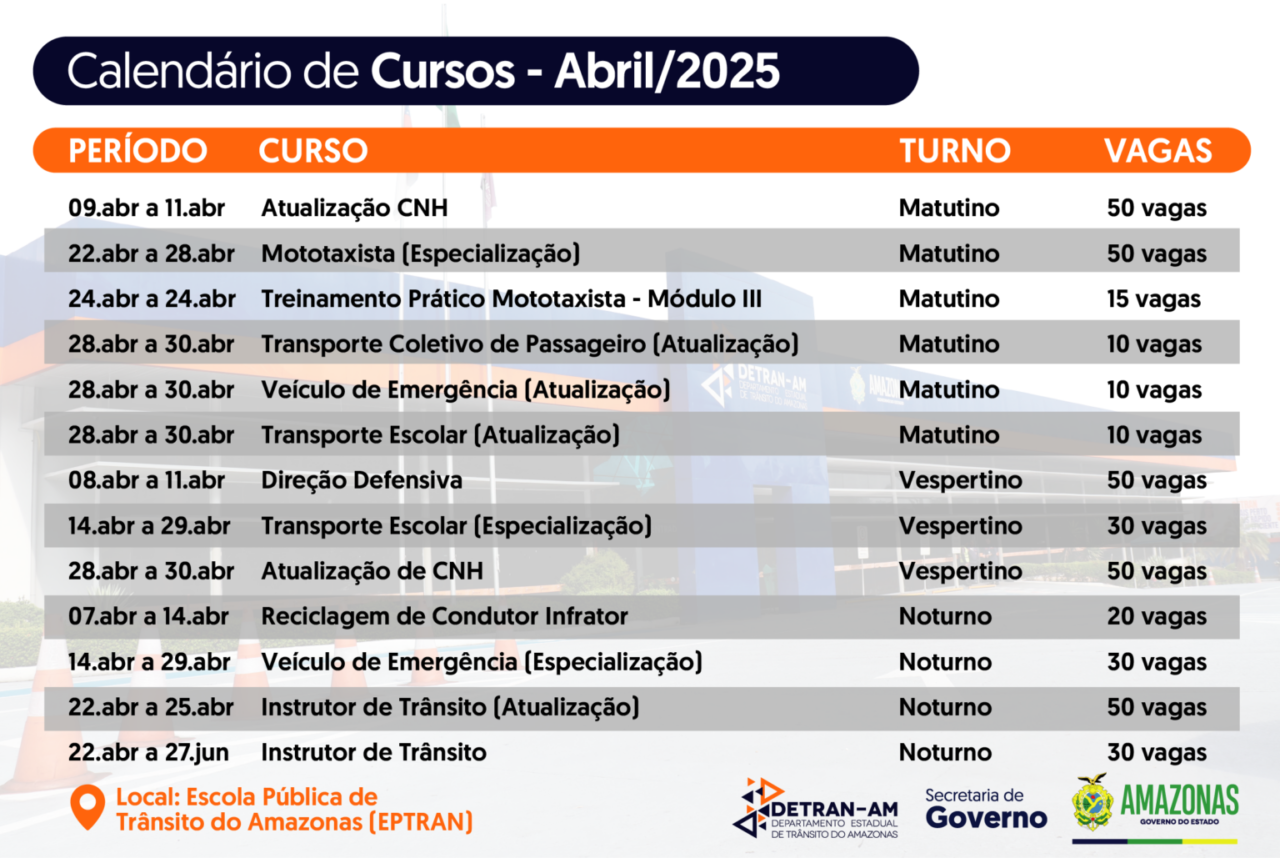MANAUS-AM | Estão abertas as inscrições para cursos gratuitos na Escola Pública de Trânsito (Eptran) ao longo de abril. São 405 vagas divididas nos turnos matutino, vespertino e noturno, além de aulas aos sábados, em Manaus.
