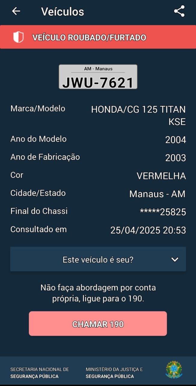 A motocicleta usada por Almir, de placa JWU-7621, apresentava restrição por roubo e foi recolhida para o pátio do 6º DIP.