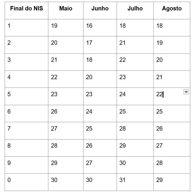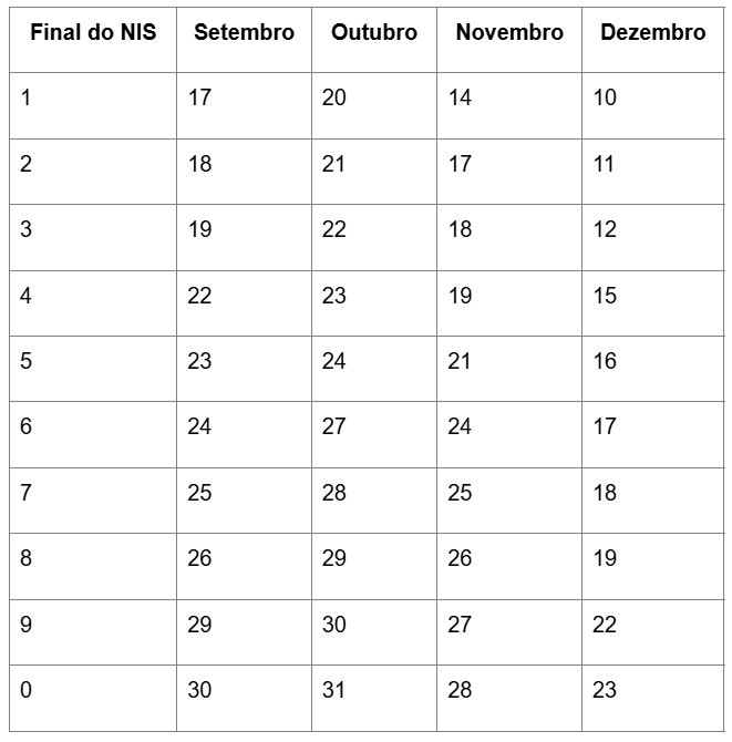 A seguir, as datas de pagamento para cada final do NIS, segundo o calendário oficial divulgado pelo Ministério do Desenvolvimento e Assistência Social (MDS).