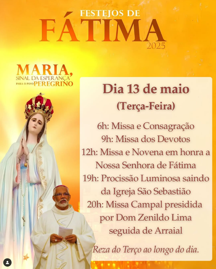 A agenda do dia inclui missas em três horários, às 6h, 9h e 12h, celebradas no Santuário de Fátima. Às 19h, uma procissão sairá da Igreja de São Sebastião, no Centro, em direção ao santuário, reunindo devotos em um momento de oração e reflexão. A programação culmina às 20h com uma Missa Campal, seguida de um arraial, que promete unir espiritualidade e confraternização com barracas de comidas típicas e apresentações culturais.