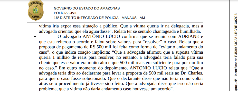 Durante a apuração da denúncia, a polícia identificou indícios de que a advogada Adriane Magalhães, que representava Marcela, tentou intermediar um acordo extrajudicial com valores que chegaram a R$ 500 mil para que a vítima não levasse o caso adiante. O advogado Antônio Lúcio, que participou de uma reunião com Adriane, relatou à polícia que a proposta teria partido dela, afirmando que a cliente — Marcela — “aceitaria não prosseguir com a denúncia mediante pagamento”.