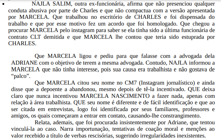 Além disso, outra ex-funcionária do escritório, Najla Salim, afirmou ter sido pressionada por Adriane para se vincular ao caso como testemunha. Ela relatou abordagens insistentes, ligações telefônicas gravadas sem consentimento e tentativas de envolver seu nome nas acusações, mesmo tendo declarado que nunca presenciou condutas abusivas por parte de Charles Garcia.