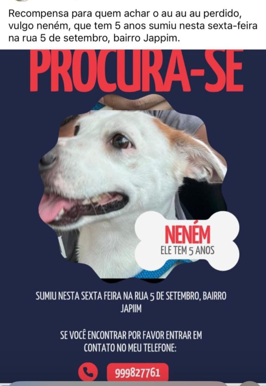 Para incentivar quem tiver informações sobre o paradeiro do cachorro, a família está oferecendo uma recompensa. Eles pedem que qualquer pessoa que tenha visto o animal ou saiba de alguma pista entre em contato pelos números (92) 9982-7761.