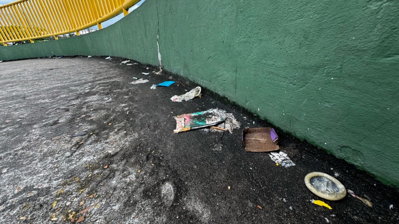 Durante visita ao local, a equipe de reportagem constatou a presença de lixo, preservativos usados e forte odor, além de relatos de que o espaço também é utilizado como abrigo improvisado.