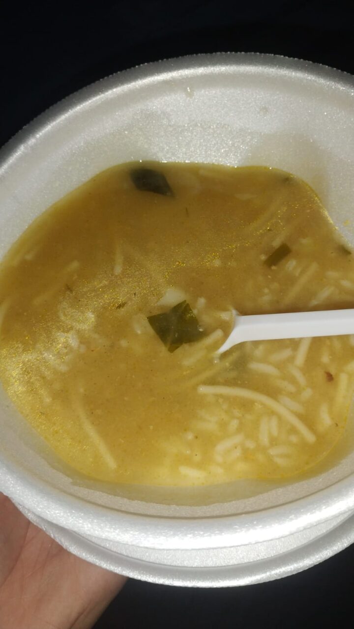 Sopa oferecida para os passageiros que estavam na embarcação ilhada. Foto: reprodução