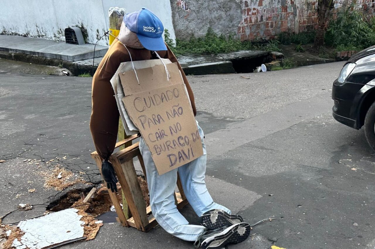 Cansados de esperar por uma solução do poder público, moradores da Rua Francisco Mello, no bairro Japiim, zona Sul de Manaus, decidiram protestar de forma inusitada contra um buraco que já dura três meses. Com humor e indignação, eles criaram um boneco e colocaram uma placa com a frase: “Cuidado para não cair no buraco do Davi”, em referência à situação crítica do local.