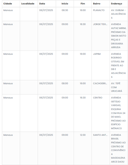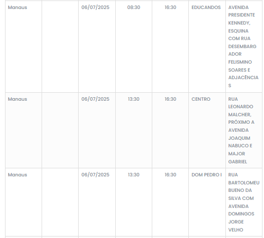 A concessionária Amazonas Energia realizará manutenções na rede elétrica neste domingo (6) resultando na interrupção temporária do fornecimento de energia em alguns bairros de Manaus. A empresa informou que os desligamentos são necessários para garantir melhorias na infraestrutura elétrica e evitar futuros problemas no sistema.