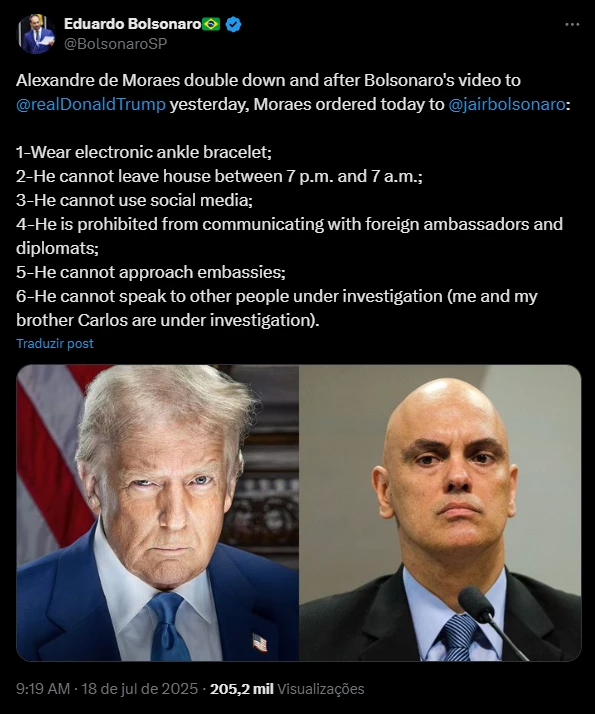 O deputado federal licenciado Eduardo Bolsonaro (PL-SP) usou a rede social X na manhã desta sexta-feira (18) para criticar o ministro do Supremo Tribunal Federal (STF), Alexandre de Moraes, a quem acusou de “dobrar a aposta” contra seu pai, o ex-presidente Jair Bolsonaro (PL). A declaração, publicada em inglês, veio em resposta à operação da Polícia Federal (PF) que cumpriu mandados judiciais contra Bolsonaro, autorizados pelo STF, incluindo medidas restritivas como o uso de tornozeleira eletrônica, recolhimento domiciliar noturno (das 19h às 6h), proibição de uso de redes sociais e veto a contatos com embaixadores, diplomatas e outros investigados, incluindo Eduardo e seu irmão, Carlos Bolsonaro.Segundo Eduardo, as medidas foram uma retaliação direta a um vídeo publicado por Jair Bolsonaro na noite de quinta-feira (17), endereçado ao presidente dos Estados Unidos, Donald Trump, no qual o ex-presidente brasileiro reforça sua narrativa de “perseguição política”. Eduardo, que se mudou para os EUA e tem articulado sanções contra Moraes junto ao governo Trump, afirmou que o ministro intensificou as ações contra seu pai após a divulgação do vídeo. “Alexandre de Moraes redobrou a aposta, depois do vídeo de Bolsonaro para Donald Trump, ele ordenou a prisão de Jair Bolsonaro para hoje”, escreveu Eduardo no X, listando as restrições impostas ao ex-presidente.