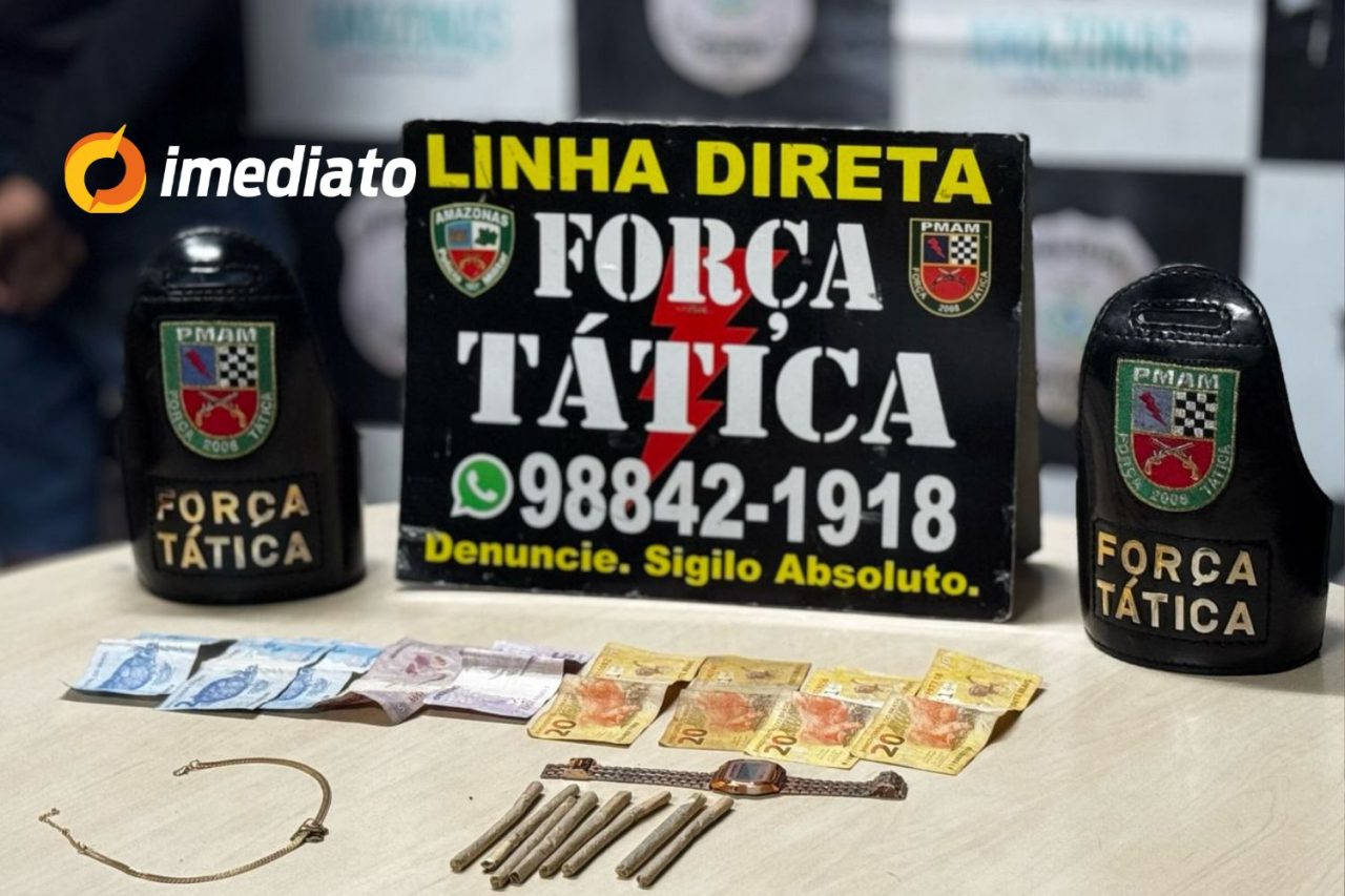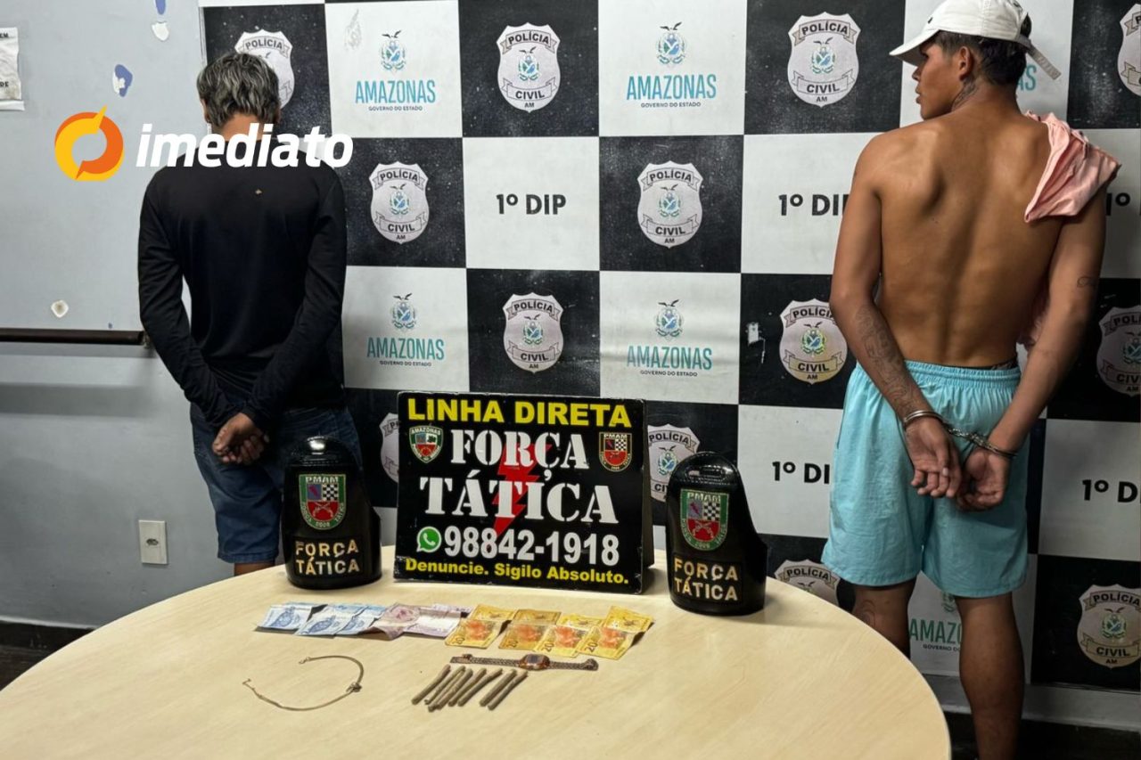 De acordo com a polícia, os agentes estavam em ronda pela rua São Benedito quando avistaram os suspeitos. Um deles, maior de idade, de 23 anos, já possui antecedentes criminais por tráfico de drogas. Durante a abordagem, foram apreendidos R$ 96 e pequenas porções de entorpecentes.