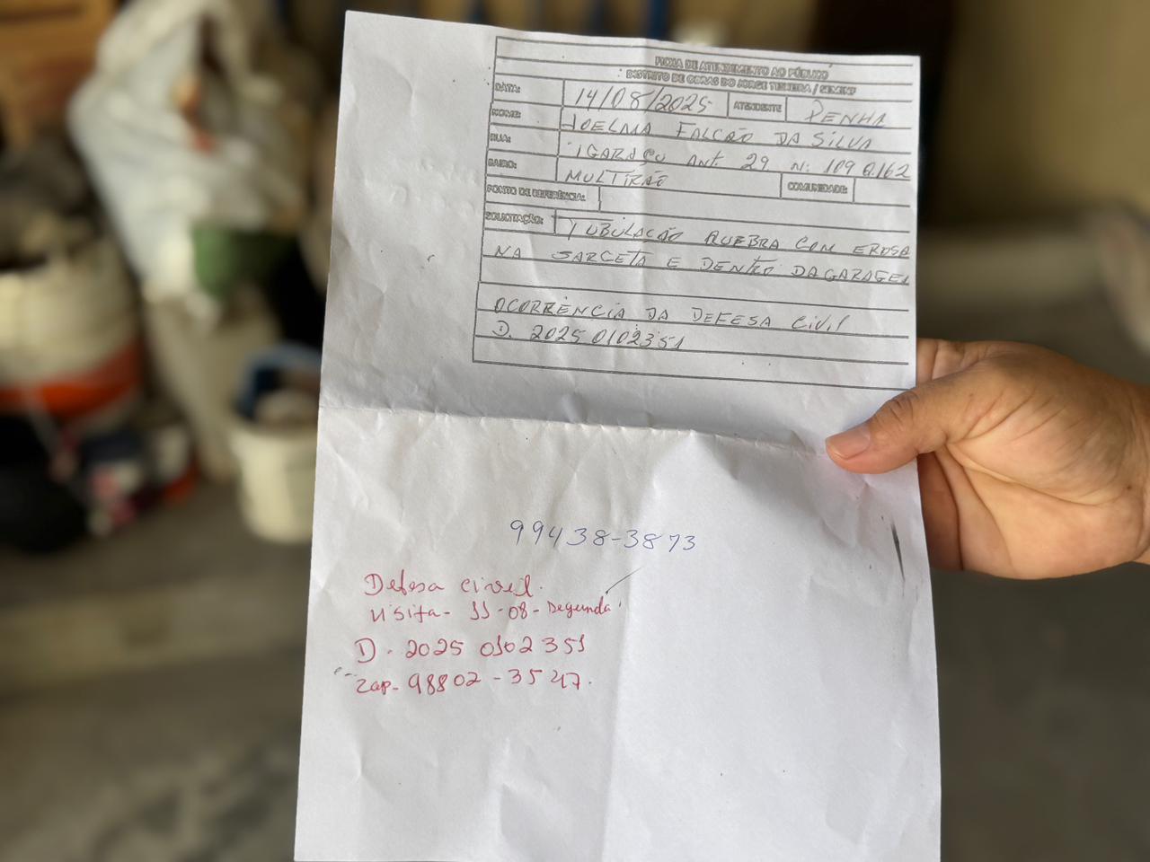 A Defesa Civil de Manaus visitou o local, realizou registros fotográficos e produziu um vídeo, mas orientou Joelma a aguardar devido à alta demanda de serviços. A Secretaria Municipal de Infraestrutura (Seminf) também foi acionada, mas, segundo a moradora, a resposta foi semelhante: um pedido para esperar. Em maio de 2025, a Seminf realizou a recuperação estrutural de um trecho da Rua Itaetê, no mesmo bairro, com serviços de drenagem profunda e superficial, mas a área da casa de Joelma não foi contemplada.