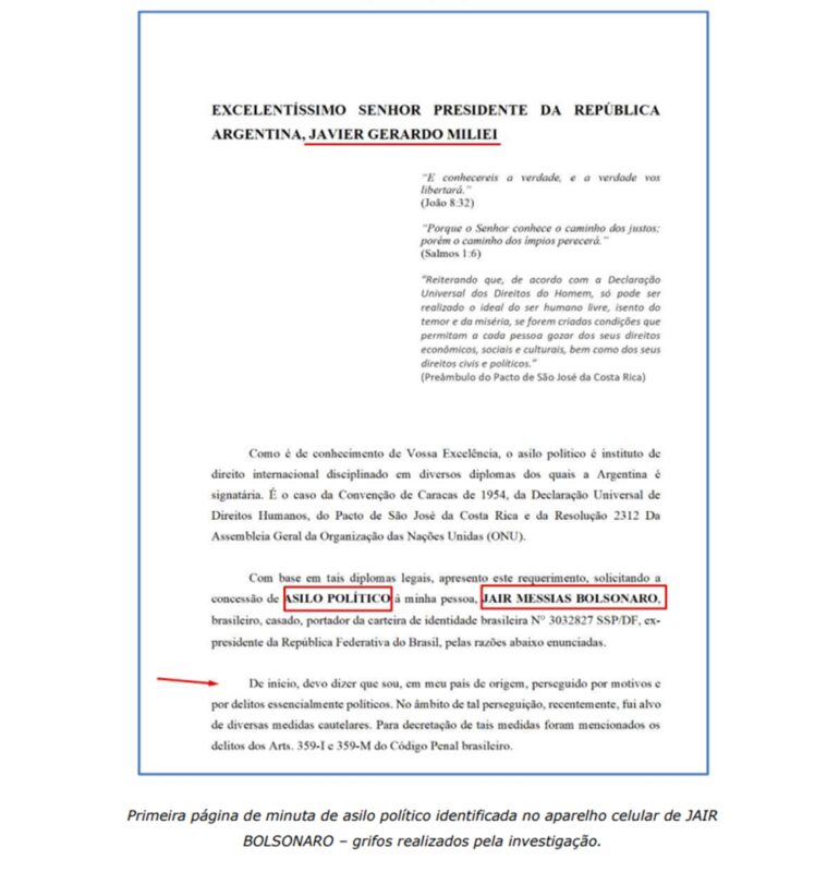 O documento, um rascunho de 33 páginas sem assinatura ou data, foi salvo no celular de Bolsonaro em 10 de fevereiro de 2024, dois dias após a Operação Tempus Veritatis, que investigou a tentativa de golpe de Estado. Dirigido ao presidente da Argentina, Javier Milei, o texto alega que Bolsonaro seria um “perseguido por motivos políticos” e solicita asilo em regime de urgência. A PF aponta que o arquivo foi criado por um usuário identificado como “Fernanda Bolsonaro”, possivelmente Fernanda Antunes Figueira Bolsonaro, nora do ex-presidente e esposa do senador Flávio Bolsonaro.