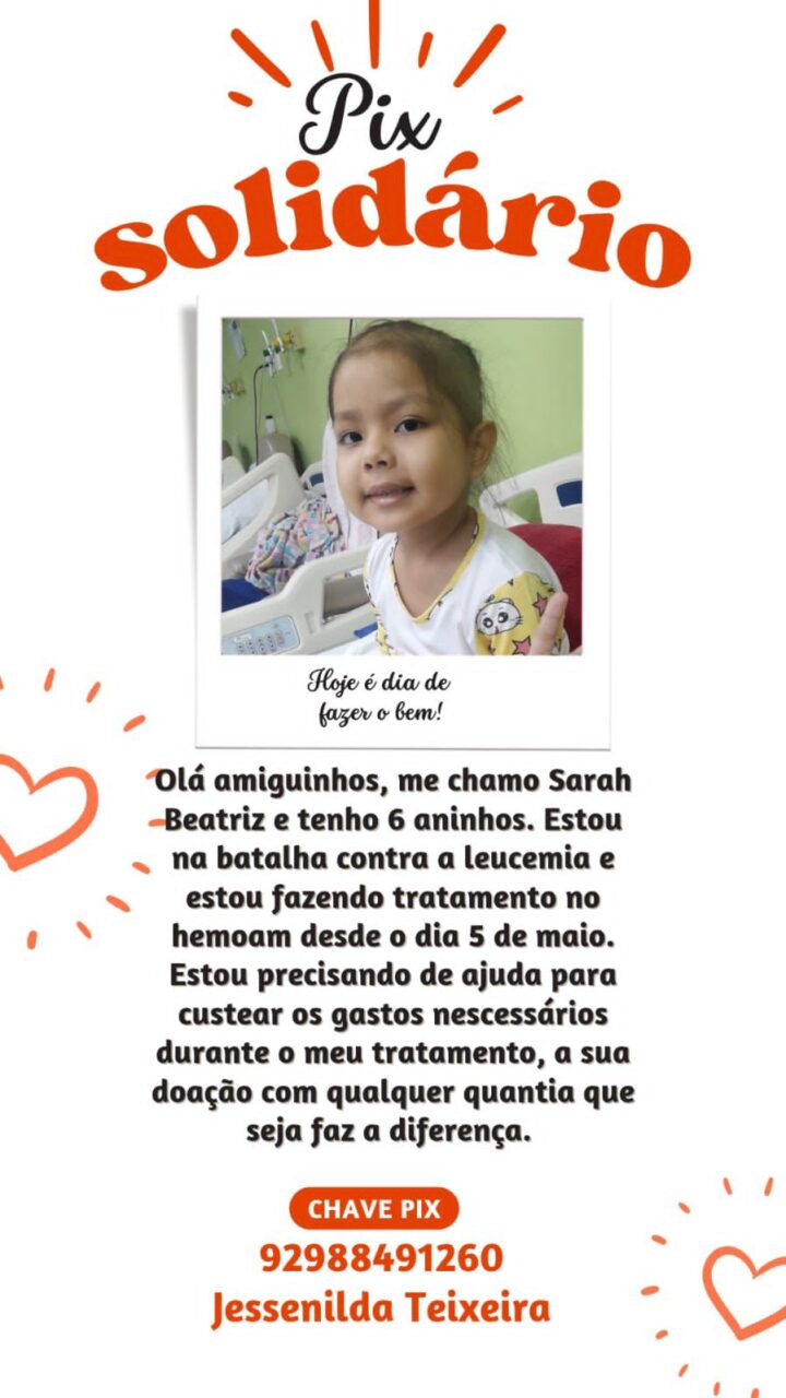 MANAUS-AM | A pequena Sarah Beatriz, de apenas 6 anos, enfrenta uma batalha contra a leucemia desde o dia 5 de maio deste ano. A criança está em tratamento no Hemoam (Fundação Hospitalar de Hematologia e Hemoterapia do Amazonas), onde realiza sessões de quimioterapia, mas sua família tem enfrentado dificuldades financeiras para custear os gastos extras que o tratamento exige.