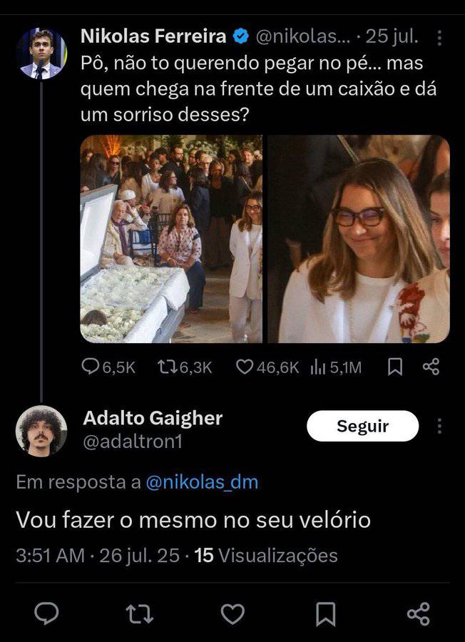 Antes disso, em julho de 2025, o estudante escreveu: “Vou fazer o mesmo no seu velório”, referindo-se a uma postagem de Nikolas sobre a primeira-dama Janja Lula da Silva. A ameaça mais antiga registrada remonta a 2023, quando Gaigher conclamou: “Que tristeza que esse Nikolas existe, cara. Alguém mata esse cara na moral”, durante a visita do presidente Lula à Câmara dos Deputados.