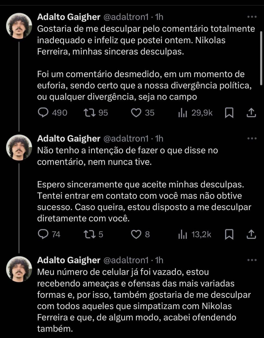 Após a repercussão das postagens, que viralizaram e geraram repúdio nas redes sociais, Gaigher publicou um pedido de desculpas: “Gostaria de me desculpar pelo comentário totalmente inadequado e infeliz que postei ontem. Nikolas Ferreira, minhas sinceras desculpas. Foi um comentário desmedido, em um momento de euforia, sendo certo que a nossa divergência política, ou qualquer divergência, seja no campo”. No entanto, o deputado rejeitou as desculpas, afirmando: “Você só está falando isso porque a postagem viralizou. Não aceito desculpa alguma e não recuarei um milímetro em mover todas as ações cabíveis contra a sua atitude”. Ferreira ainda destacou o histórico de ameaças: “Já não é a primeira vez. O que mostra que não houve nenhum arrependimento, somente o medo das consequências. Enfrente-as agora”.