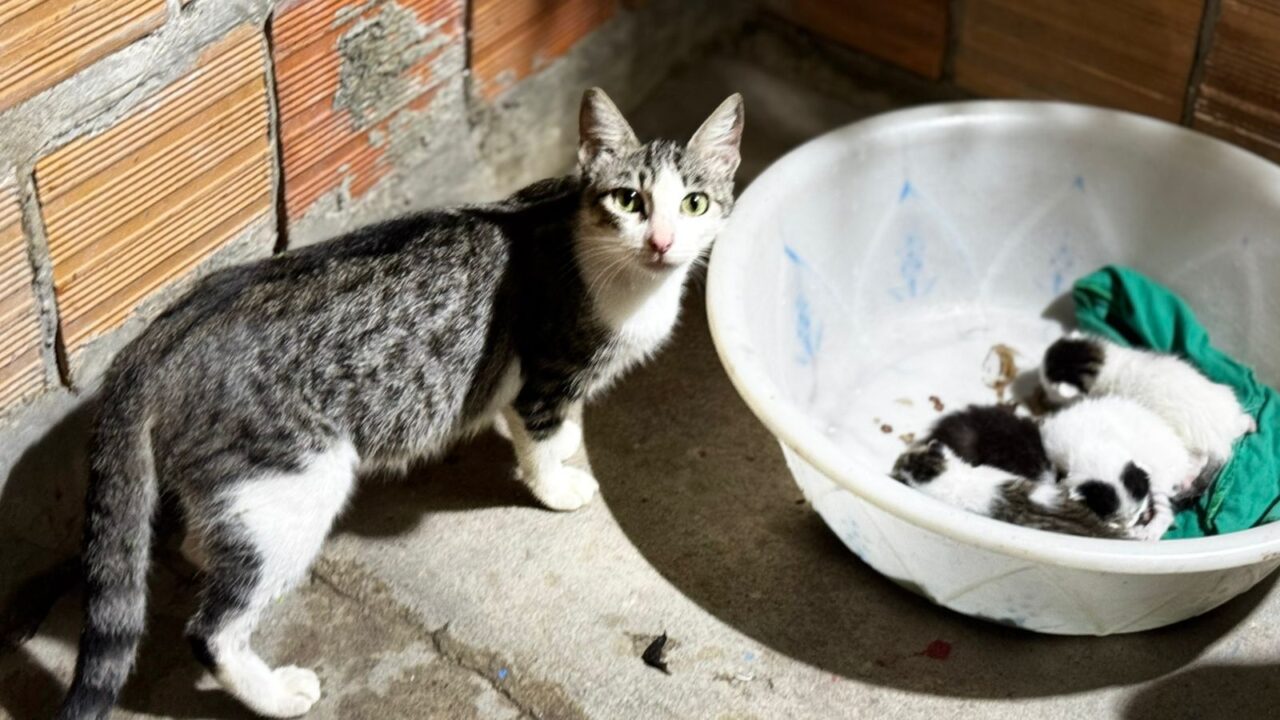 A dona da residência, identificada como Sara, contou que ajudou a felina quando percebeu que ela estava prenha. A gestação, porém, terminou dentro de sua casa, e agora ela busca apoio para encontrar novos lares para os gatinhos. “Eu dei comida pra ela, mas não tenho condições de criar os filhotes. Tenho problema respiratório e não posso ficar com eles”, explicou.