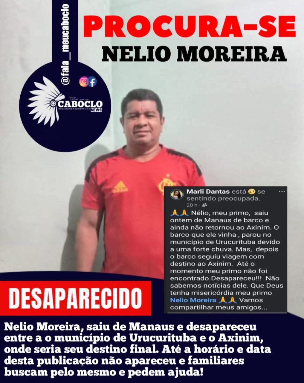 A família de Nélio Conceição Moreira, de 47 anos, busca informações sobre o paradeiro dele após o desaparecimento registrado no último sábado (26), durante uma viagem de barco ao distrito de Axinim, no município de Borba, a 151 quilômetros de Manaus.