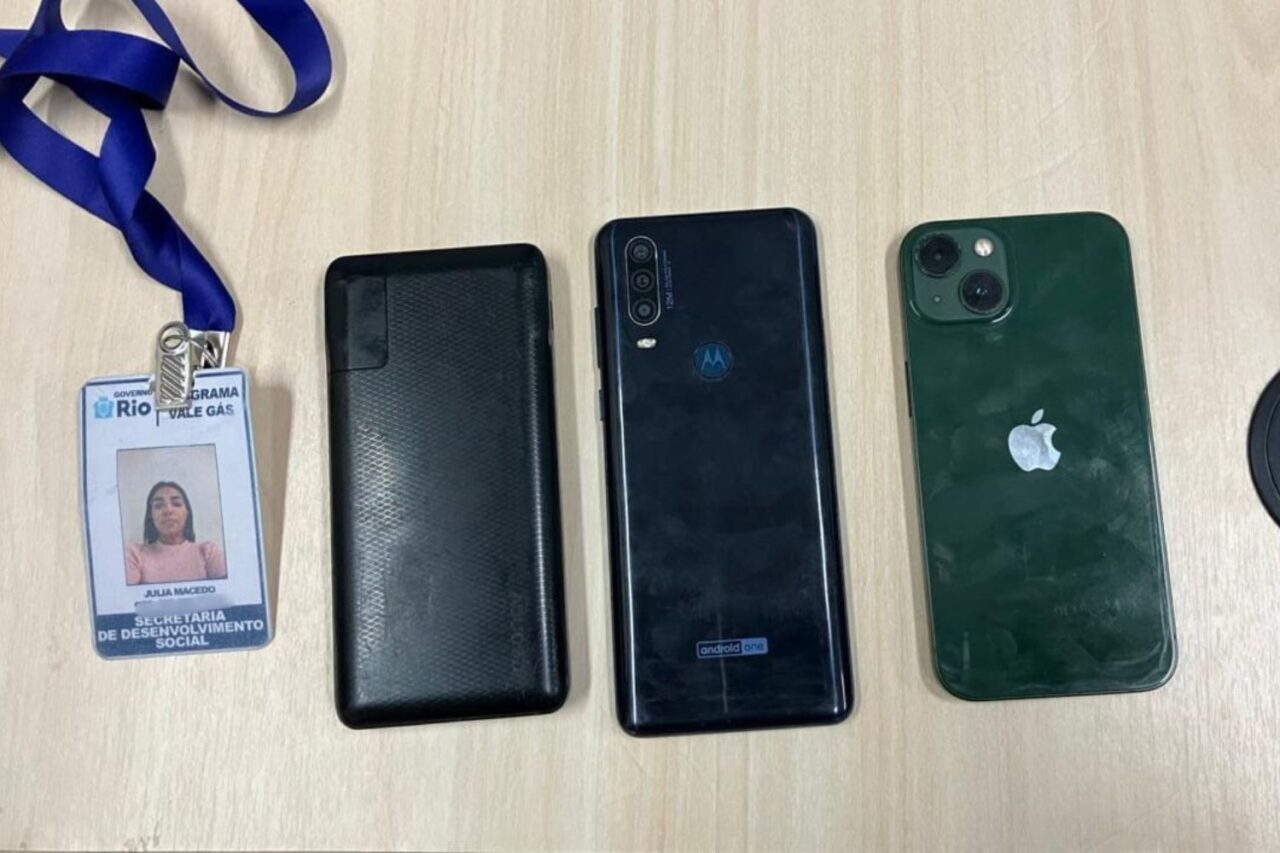Durante a abordagem, foram apreendidos um celular Motorola azul, um iPhone 13 verde e um carregador portátil preto.