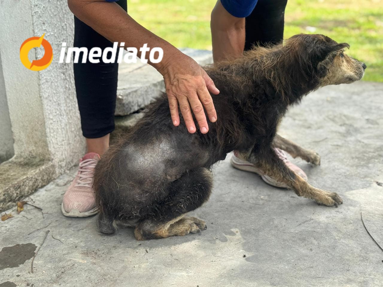 Imagens feitas no local mostram o tumor do lado esquerdo da cadela, que apresenta secreção e causa dores intensas. O caso mobilizou moradores e voluntários que pedem o resgate imediato do animal.