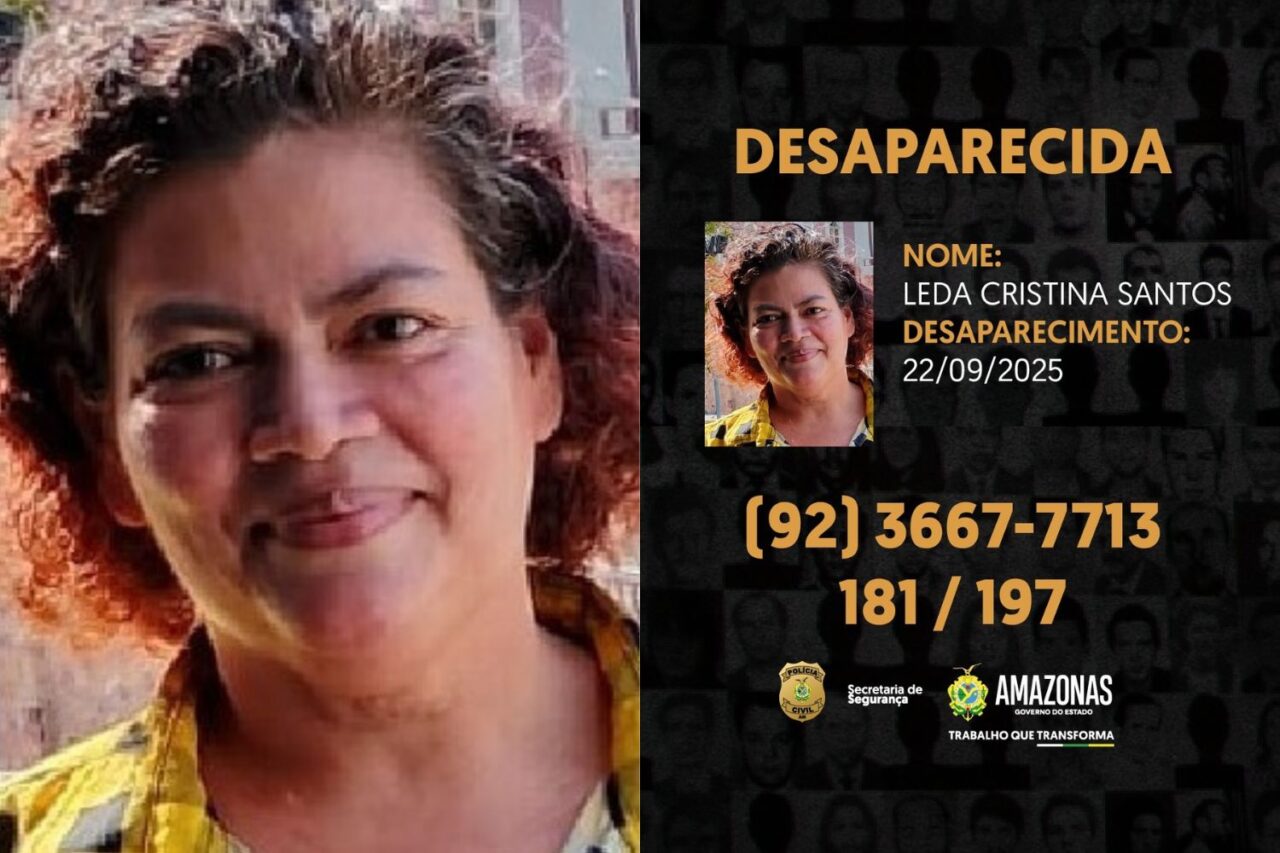 A Polícia Civil do Amazonas (PC-AM) divulgou nesta semana a imagem de Leda Cristina Santos, de 52 anos, que está desaparecida desde o dia 22 de setembro. Ela foi vista pela última vez na Rua dos Rubis, no bairro Nossa Senhora das Graças, zona centro-sul de Manaus, por volta do meio-dia.