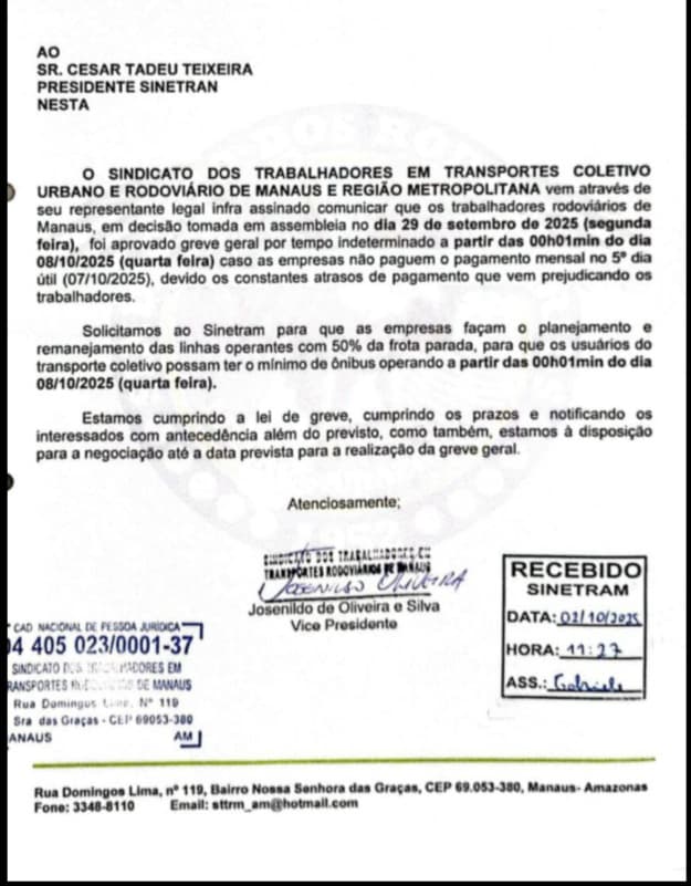 Em conformidade com a Lei de Greve, o STTRCUR notificou o Sindicato das Empresas de Transporte de Passageiros do Estado do Amazonas (Sinetram) e solicitou que as operadoras preparem um plano de remanejamento das linhas, garantindo pelo menos 50% da frota em operação durante a paralisação, a fim de reduzir os impactos sobre os usuários.