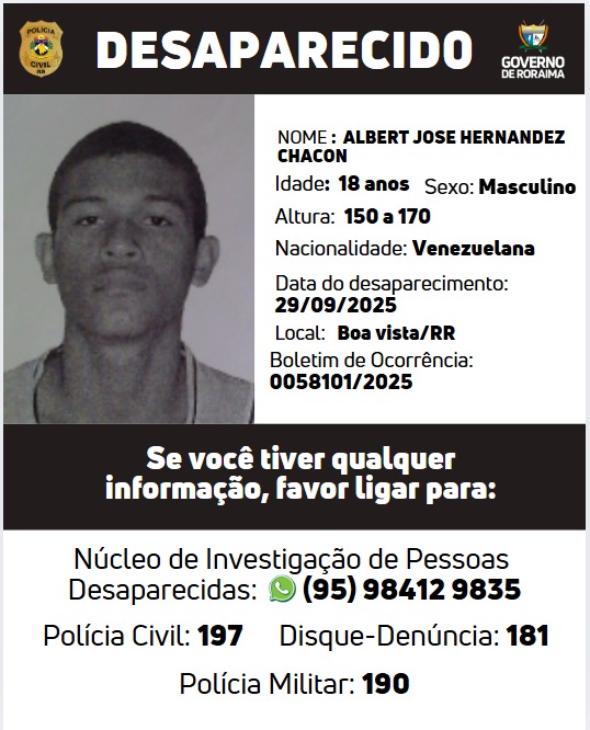 Outro caso é o de Albert Jose Hernandez Chacon, de 18 anos, nacionalidade venezuelana, desaparecido em 29 de setembro de 2025, em Boa Vista. Ele mede entre 1,50 e 1,70 metro e está registrado no Boletim de Ocorrência nº 0058101/2025.