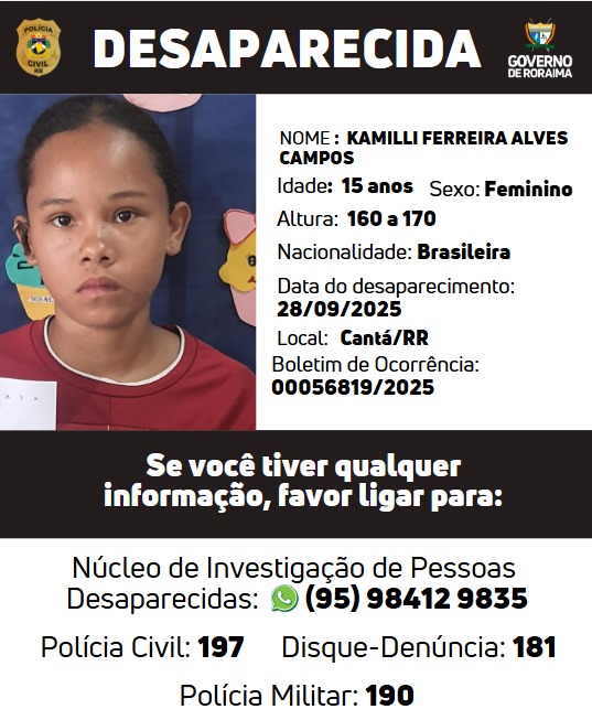 Kamilli Ferreira Alves Campos, de 15 anos, desapareceu no dia 28 de setembro de 2025, no município de Cantá. A adolescente, de 1,60 a 1,70 metro de altura, é brasileira e foi registrada no Boletim de Ocorrência nº 00056819/2025.