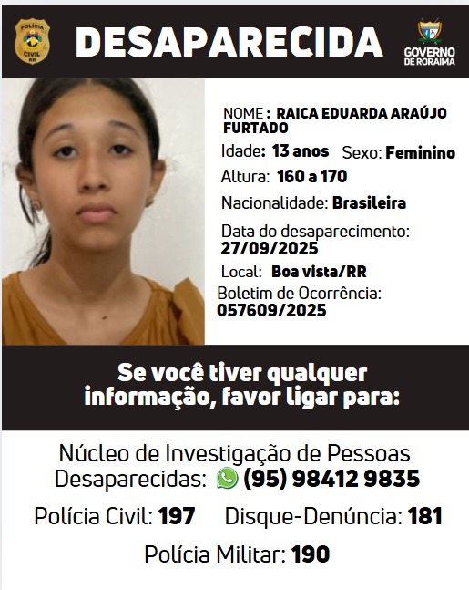 O terceiro registro é o de Raica Eduarda Araújo Furtado, de 13 anos, desaparecida desde 27 de setembro de 2025, em Boa Vista. A adolescente, de 1,60 a 1,70 metro de altura, está registrada no Boletim de Ocorrência nº 057609/2025.