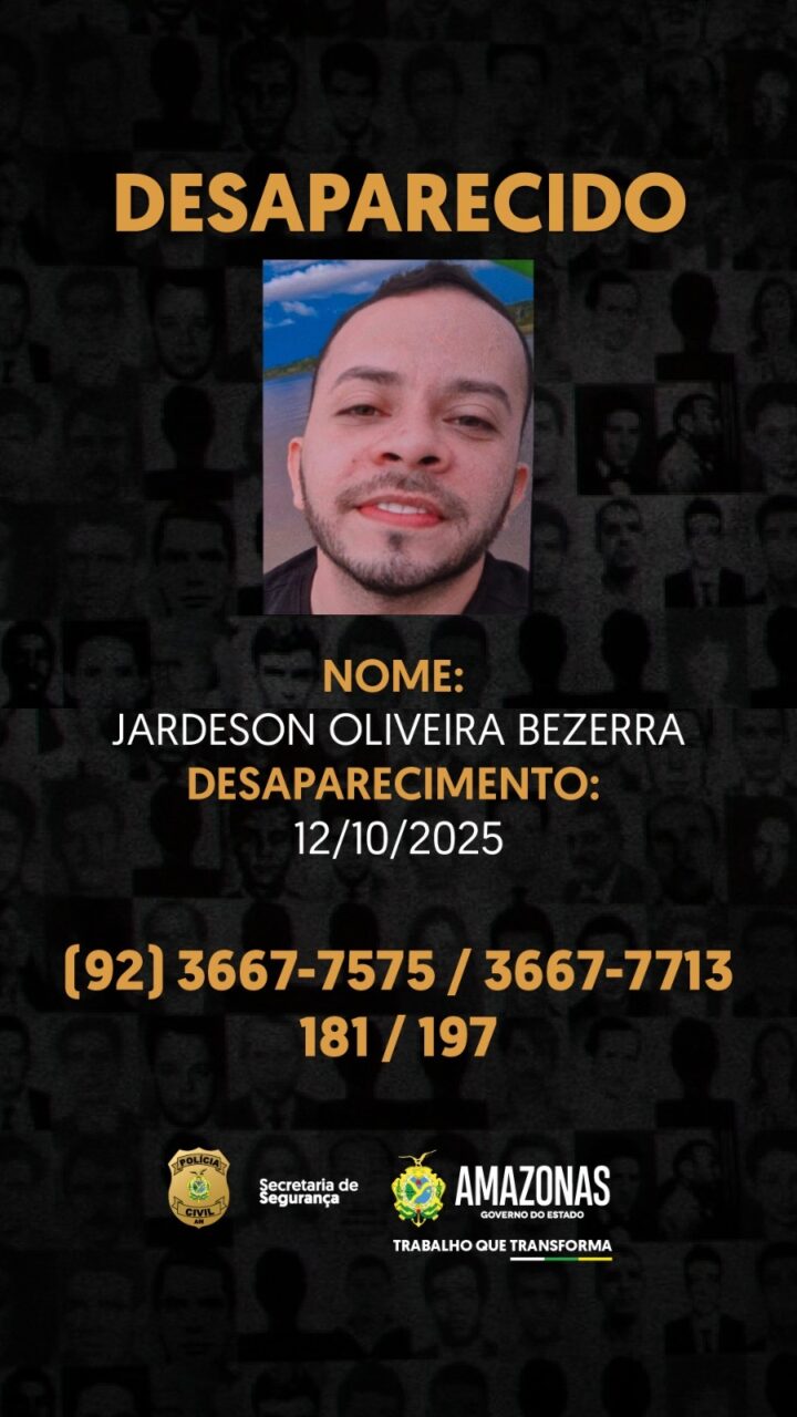 MANAUS-AM | A Polícia Civil do Amazonas (PC-AM), por meio da Delegacia Especializada em Ordem Política e Social (Deops), divulgou nesta quarta-feira (15/10) imagens de Jardeson Oliveira Bezerra, de 30 anos, que está desaparecido desde o último domingo (12/10).