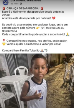 Belém (PA) – Um menino de seis anos, identificado como Paulo Guilherme Guerra, que estava desaparecido desde a noite de domingo (26), foi encontrado morto dentro de uma mala na tarde desta segunda-feira (27) em frente ao Cemitério São Jorge, no bairro da Marambaia, em Belém. A criança havia sido vista pela última vez brincando de futebol na rua onde morava, na Passagem Curuzu.