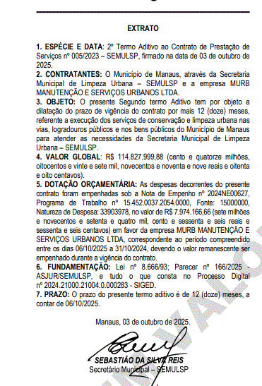 O documento foi publicado no Diário Oficial do Município (DOM) na última quarta-feira (5) e mantém a Murb responsável pelos serviços de limpeza urbana em Manaus, mesmo estando sob investigação da Polícia Federal (PF).