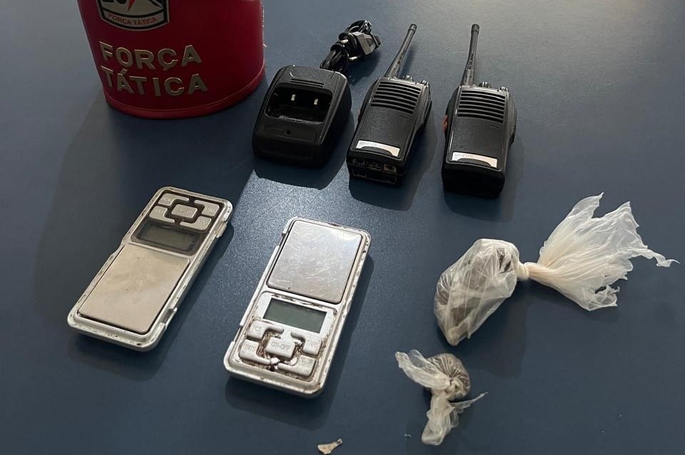 Durante a abordagem, os policiais encontraram com o suspeito dois invólucros de substância análoga a skunk e uma balança de precisão, material comumente usado na separação e comercialização de entorpecentes. A equipe também realizou buscas dentro da residência, onde foram apreendidos mais uma balança de precisão, rádios comunicadores e uma base de carregamento dos equipamentos.