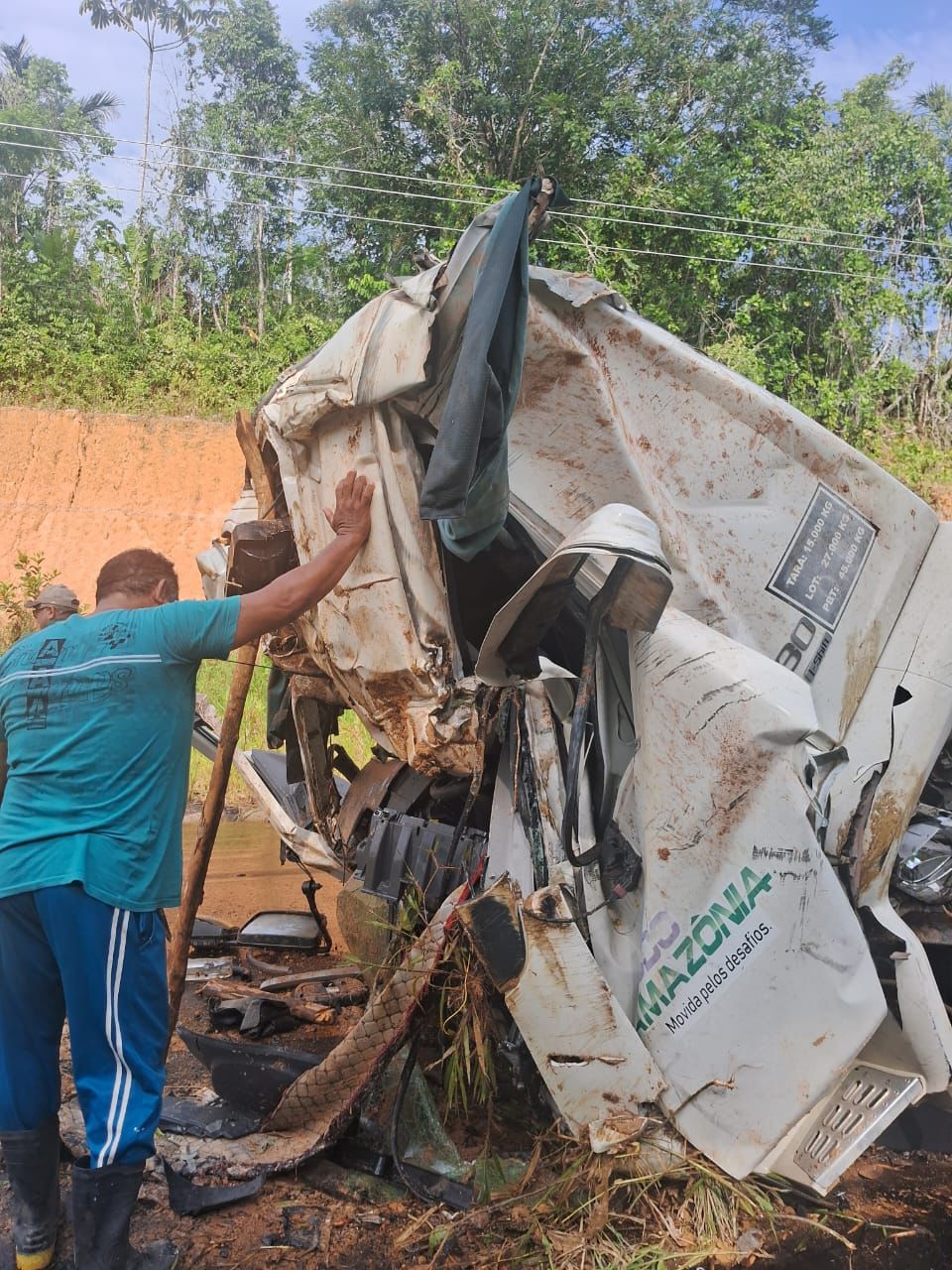 De acordo com as imagens, o veículo tombou em uma curva da via, área considerada de risco para motoristas que trafegam pelo trecho. O caminhão aparece com a cabine destruída e parcialmente virado para fora da pista, em meio à vegetação às margens da rodovia.