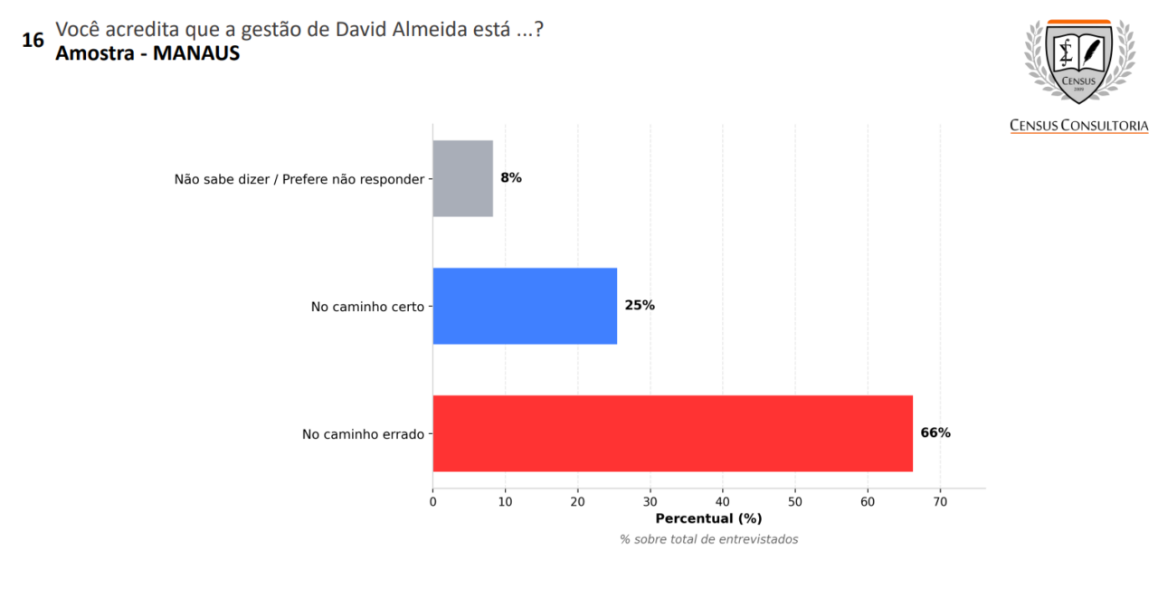 Outro ponto sensível identificado pela Census é a percepção de que o prefeito não entrega o que promete. Quando questionados sobre o cumprimento das propostas de campanha, 72% dos entrevistados respondeu que David Almeida não tem alcançado os compromissos assumidos.