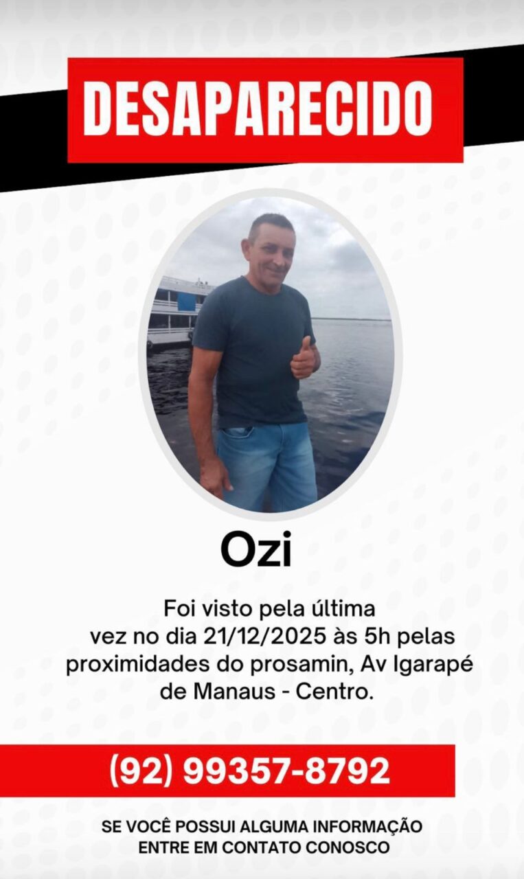 Ozimar de Lima Aguiar, de 54 anos, está desaparecido desde a manhã do último domingo (21), no centro de Manaus. De acordo com familiares, ele foi visto pela última vez por volta das 5h nas proximidades do Prosamim, bairro onde mora. Desde então, não há informações sobre seu paradeiro.